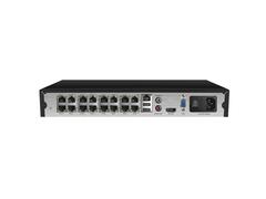 Встроенный коммутатор на 16 портов с PoE до 200 метров. Процессор MC6830, операционная система Linux, поток до 130Mbps. Режимы записи в реальном времени (25fps): 12 каналов 4K, 16 каналов с разрешением 5/4/3/2/1,3/1 Мп. Воспроизведение: 1 канал 4К/5Мп / 2 канала 4/3Мп / 4 канала 2/1,3/1 Mп. 2 видеовыхода: 1хHDMI 4К (3840×2160/30Гц), 1xVGA (1920×1080/60Гц). 1 жесткий диск SATA HDD до 8TB. Аудио: 1 вход / 1 выход RCA (G711u, G711a, ADPCM_DVI4). 16 портов 100Mbps PoE 15Вт (IEEE 802.3af) / 1 WAN Ethernet RJ45 1000Mbps. Бюджет PoE 200Вт, 3 USB2.0. Питание 110-240В, ≤10Вт (без диска и POE). Размеры 310x295x46мм. Вес 4кг. Приложение BitVision.