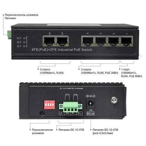 Поддержка PoE (IEEE 802.3af/at/bt), порт №1 до 90Вт, бюджет PoE 180Вт..Режим CCTV - дальность передачи данных до 250м на скорости до 10 Мбит/с. Функция PoE Watchdog - контроль и перезапуск устройств с PoE по питанию. Защита портов от перенапряжения, короткого замыкания и переполюсовки. Питание DC 48-55В. Рабочая температура -30…+65°С, монтаж на DIN-рейку, размеры 119x87x28 мм, вес 500 г.